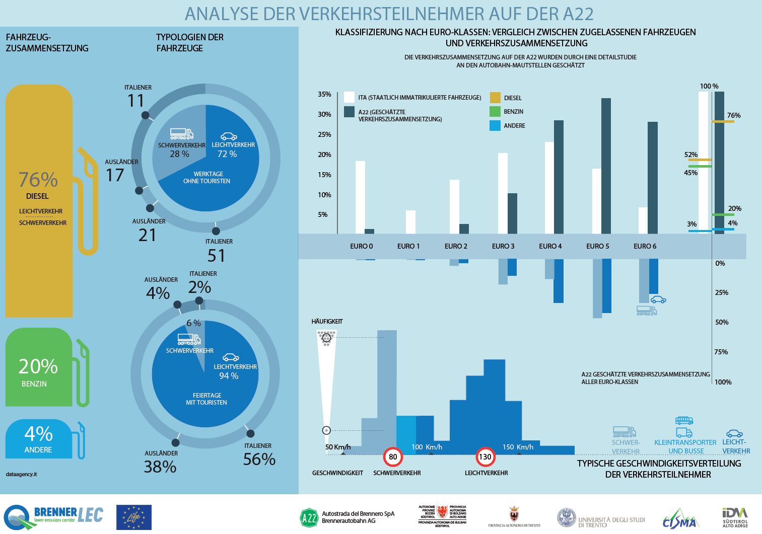 Dank einer Reihe von Untersuchungen im Rahmen des Projektes BrennerLEC liegt nun ein sehr klarer Bericht über jene Fahrzeuge auf der A22 vor, die im Jahr 2017 zwischen Brenner und Affi unterwegs waren. Anzahl, Fahrzeugtyp, Herkunfts- und Bestimmungsort, Staatsangehörigkeit, Abgase, Durchschnittsgeschwindigkeit, mittler Kraftstoffverbrauch, Fahrzeugantrieb: mithilfe all dieser Informationen zu den Fahrzeugen auf der A22 können die Versuche des Projektes BrennerLEC zur Vermeidung von Schadstoffen durch dynamische Geschwindigkeitsbegrenzungen weitergeführt werden.