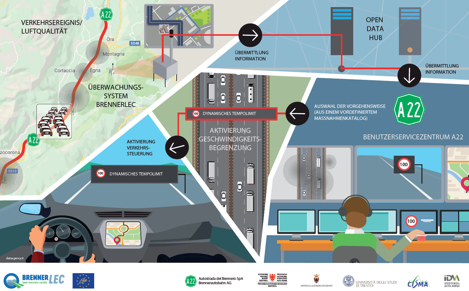 Die Infografik stellt in qualitativer Weise das durch das Projekt aktivierte Überwachungssystem dar. Die Interessenbereiche sind drei: das Wetter, der Verkehr und die Umwelt. Die Wetterbedingungen sind notwendig um genaue Vorhersagen für die Ausbreitung der Schadstoffe in der Atmosphäre zu machen, sie wurden mithilfe traditioneller Wetterstationen und einem Schallpegelmessgerät (welches in der Lage ist, die vom Verkehr produzierten Turbulenzen zu beurteilen) gemessen. Der Verkehr wird mit herkömmlichen Induktionsschleifen gemessen, welche durch neue Techniken integriert werden um die Fahrzeiten zu ermitteln. Die Fahrzeiten werden auf der Autobahn als auch auf außerstädtischen Straßen durch einen anonymen Scan von Telepass und Bluetooth-Geräten der Fahrzeuge gemessen. Die Umweltbedingungen (Luft- und Lärmqualität) werden mit herkömmlichen Instrumenten der Messstationen der Landesagenturen von Südtirol und dem Trentino gemessen, aber auch mit Instrumenten, welche auf nicht konventionelle Technologien basierenden. Das Monitoring der Luftqualität ist eines der wissenschaftlichsten Aspekte des Projektes, da es die Messung von noch nicht so bekannten Schadstoffen (Industrieruß) erlaubt, zudem lässt es auch eine vergleichende und intensive Beurteilung der innovativen und günstigeren Sensoren zu, welche in Zukunft für eine ausgedehntere Überwachung entlang der Fahrbahn genutzt werden könnten. Besonderes Interesse gilt auch der Verwendung von Passivsammlern welche es erlauben, die Fünfjahres-Durchschnittswerte der NO2 -Konzentrationen in verschiedenen Entfernungen zur Autobahn zu messen. Die Erweiterung dieser Systeme erfolgt durch die Integration mit Industrieruß-Messungen und Messungen der Partikelanzahl und hat die Aufgabe, die Emissionen des Verkehrs zu charakterisieren. Schließlich werden die räumlich erfassten Daten durch ein mobiles Messsystem gemessen und die Luftschadstoffausbreitungsmodelle damit kalibriert.