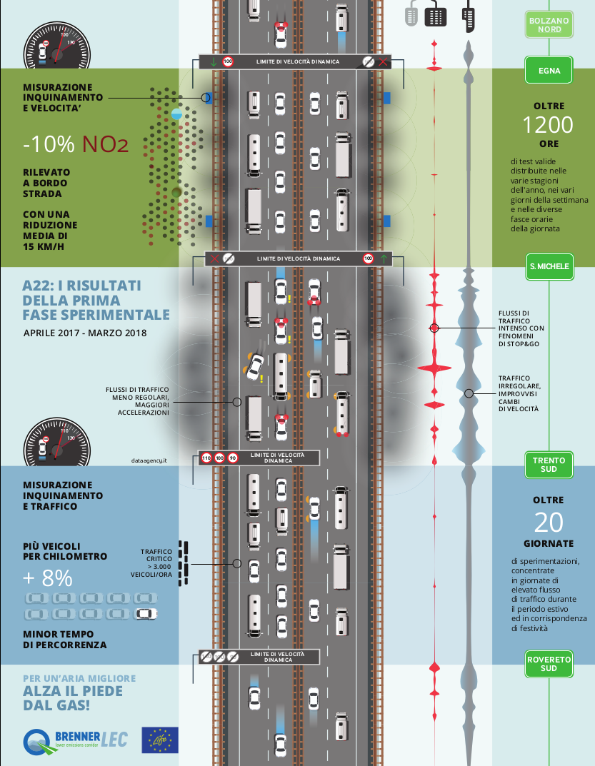 From an environmental point of view the first empirical measurements have highlighted that an average reduction of 15 [km/h] of the average speed of light vehicles, compared with the normal flow of traffic with speed limit at 130 [km/h], determines a reduction of 10% of the average concentration of NO2 (nitrogen dioxide) at the roadside of the highway.